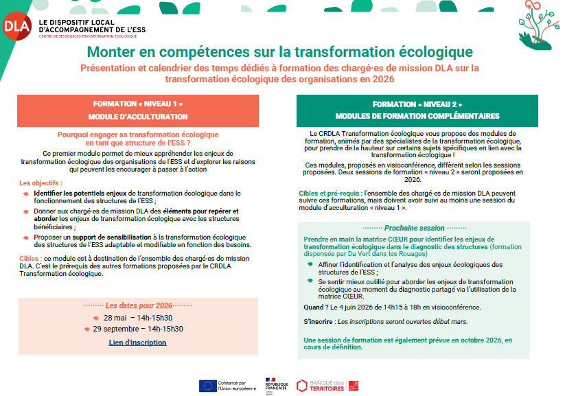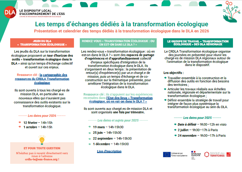 Calendrier des temps d’animation et formations DLA sur la transformation écologique ! A la une, Actualités, Approfondir, En tant que DLA, Formation e-learning Vous êtes chargé·e de mission DLA ? Retrouvez tous les temps d’animation ainsi que les temps de formations proposés par le CRDLA Transformation écologique ! Afficher le calendrier Attention : ces temps sont dédiés aux chargé·es de mission DLA uniquement